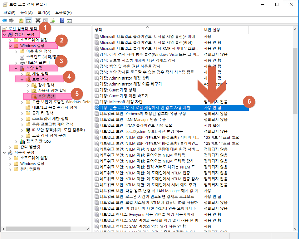 계정: 콘솔 로그온 시 로컬 계정에서 빈 암호 사용 제한 -> '사용 안 함' 변경