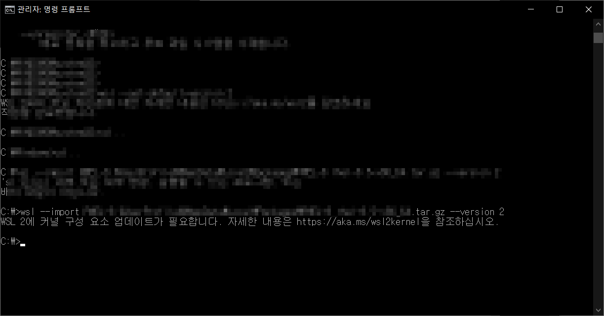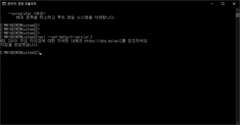 설치가 완료되면 WSL 명령어를 통하여 다시 시도한다.