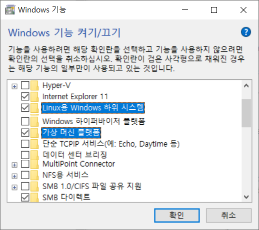 2. 리눅스용 윈도우 하위 시스템 및 가상 머신 플랫폼 설치