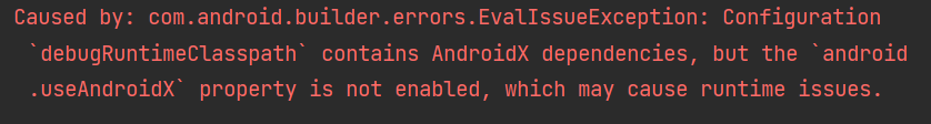 Caused by: com.android.builder.errors.EvalIssueException: Configuration `debugRuntimeClasspath` contains AndroidX dependencies, but the `android.useAndroidX` property is not enabled, which may cause runtime issues.