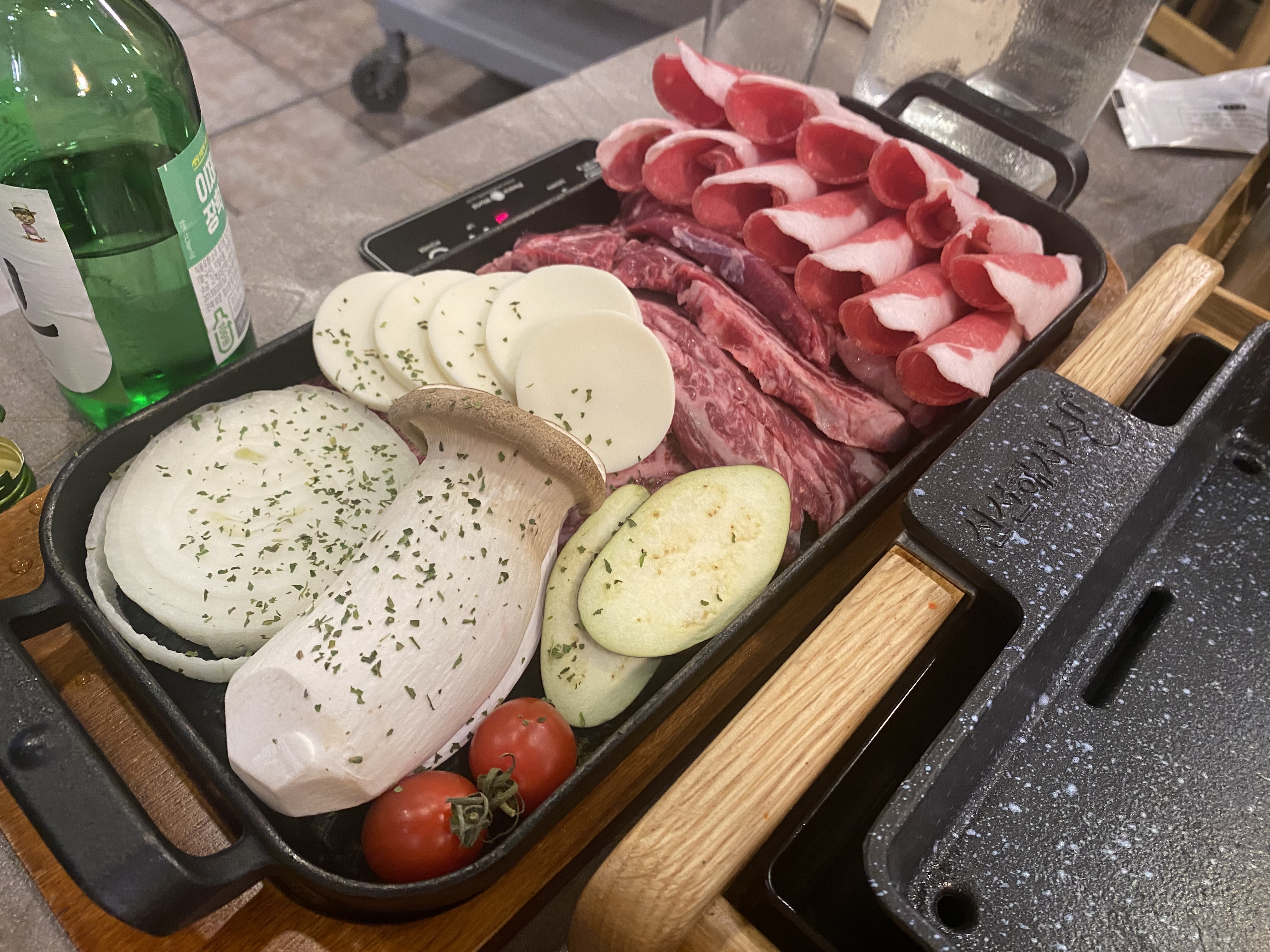 모듬에는 고기 3종과 치즈, 버섯, 구이용 방울 토마토, 가지, 양파 + 육사시미