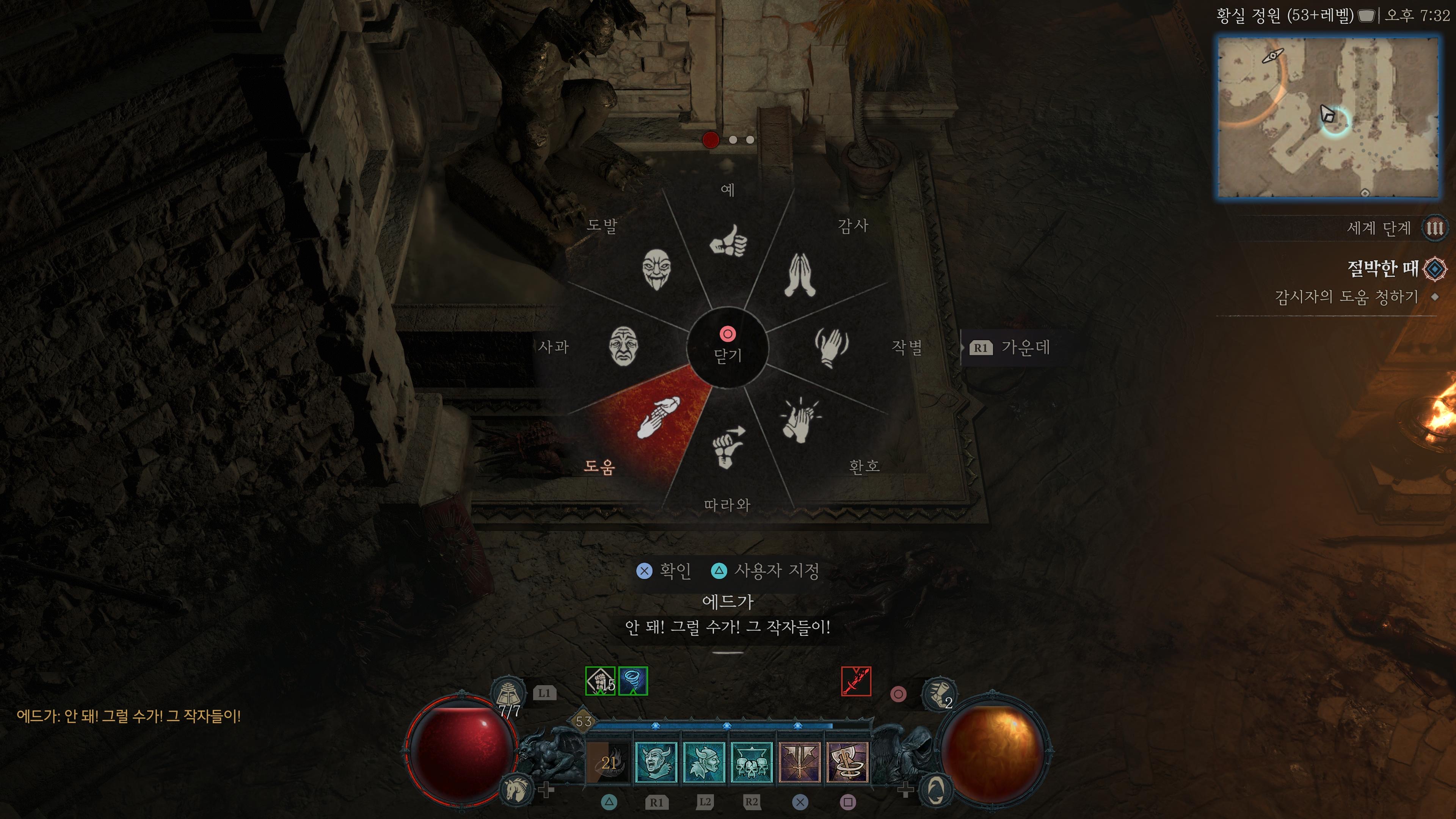 이 부분은 황실정원 제단 앞에서 감정표현 '도움'을 설정하는 것입니다. 그렇게 하면 퀘스트를 원활하게 진행할 수 있습니다.