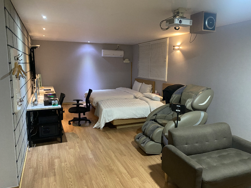 컴퓨터 두대와, 전동안마기, 그리고 트윈 침대.