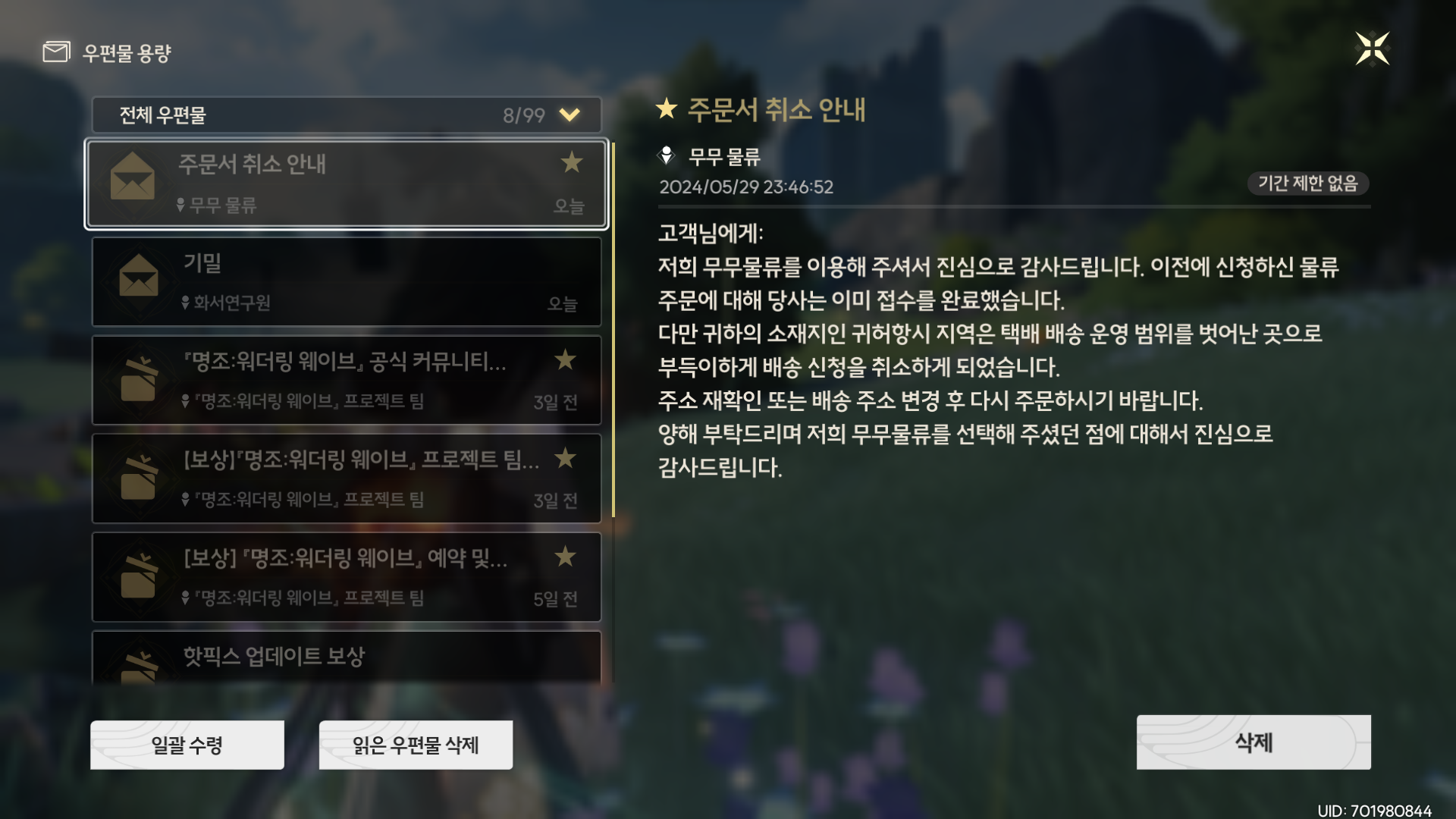 [명조:워더링웨이브] 무무물류에서 보낸 메일 확인하기 본문